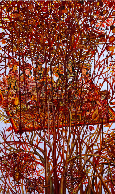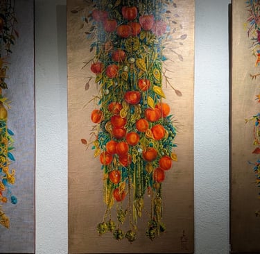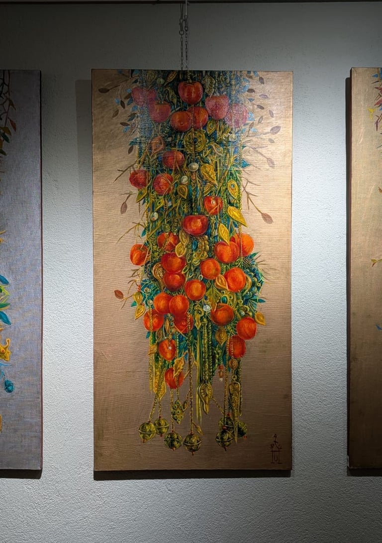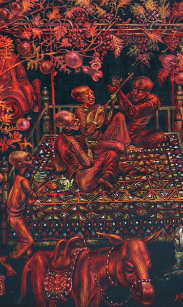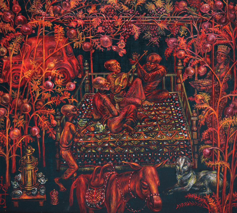 B. Amansahatov is keen on painting trees, branches with flowers and fruits. His consistent move of these motifs from the natural perception to their stylized interpretation turns them into a pattern. Ornamentation fills images with symbolic meaning. In this painting structural ornamental combination of pear, quince and pomegranate trees turn them into plastic symbol, plastic metaphor, realizing the idea of constant renewal of nature. Through the motif of lush fertile blooming of nature the artist states happiness and joy of fruitful hearth.