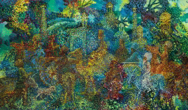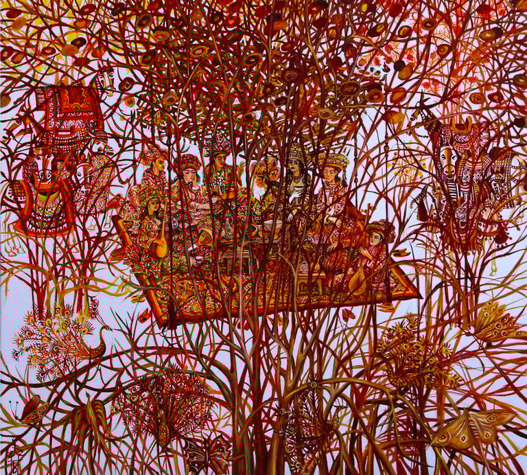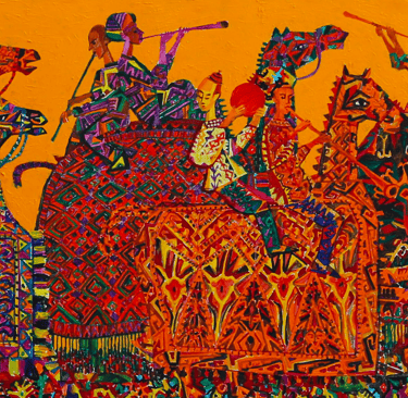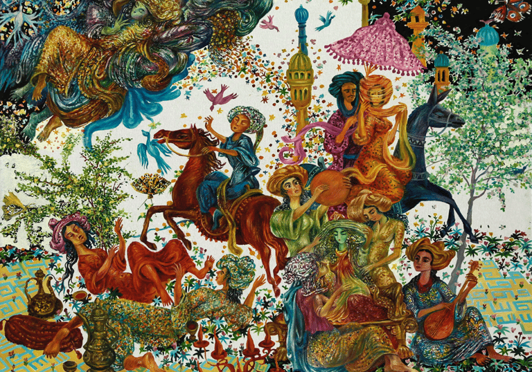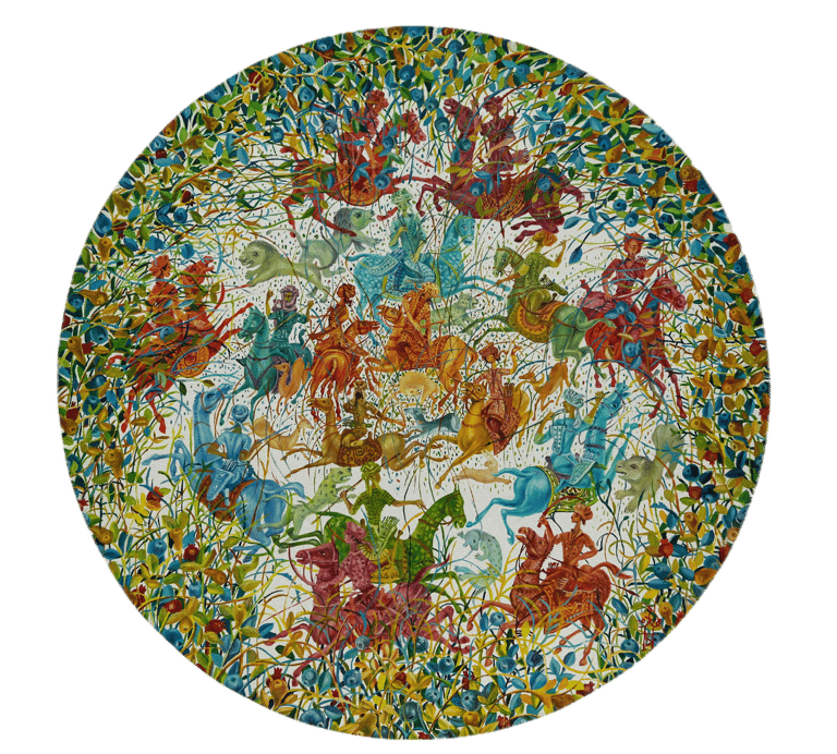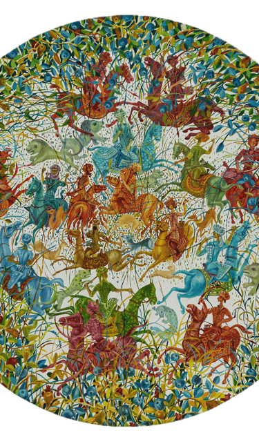The painting “The Royal Hunt” from the series “One thousand and one nights”, done in the “tondo” format, reveals the mysterious world of royal pleasures – a scene of a medieval hunt. It is a dynamic composition in a circle with refined movements of hunters, interpreted in the traditions of oriental miniatures and complemented by a circular frame of floral patterns. This vegetative - ornamental frame gives a theatrical character to the genre plot