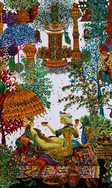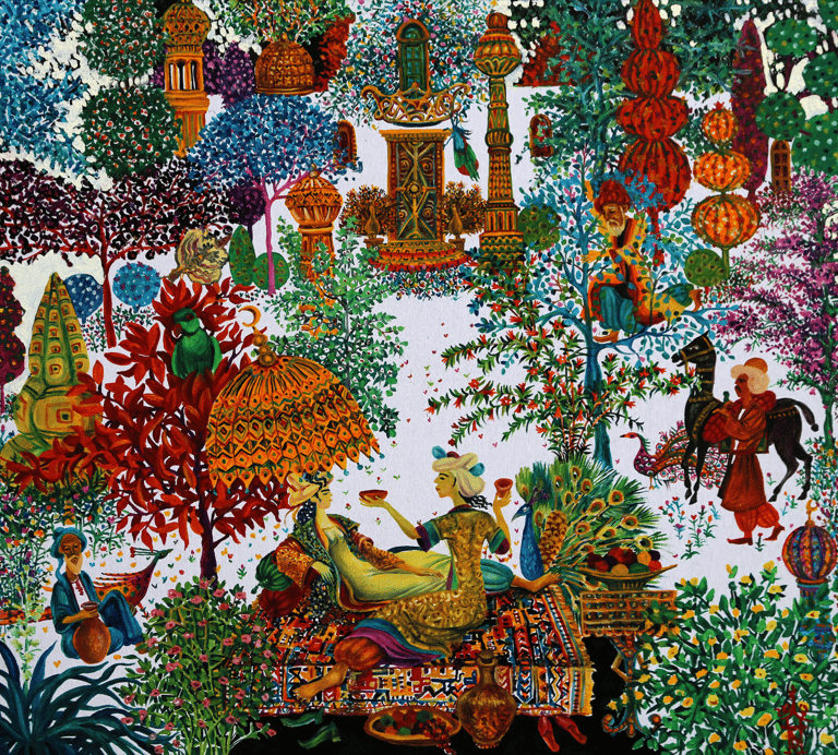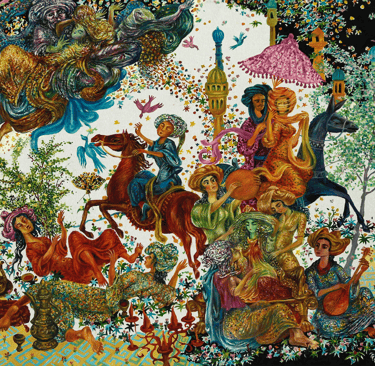 In “A tale of two viziers and Anis al-Jalis” Berdiguly Amansahatov got interested in description of Amusement and palace of Pleasure and Images belonging to the caliph of Baghdad Harun ar-Rashid. We see Nur-ad-Din, feasting with his beloved Anis-al-Jalis, the gardener, Sheikh Ibrahim with a jug filled with wine, as well as the Caliph, dressed into merchant’s clothes, who has climbed a tree to observe the happening of his companion, vizier Jafar.