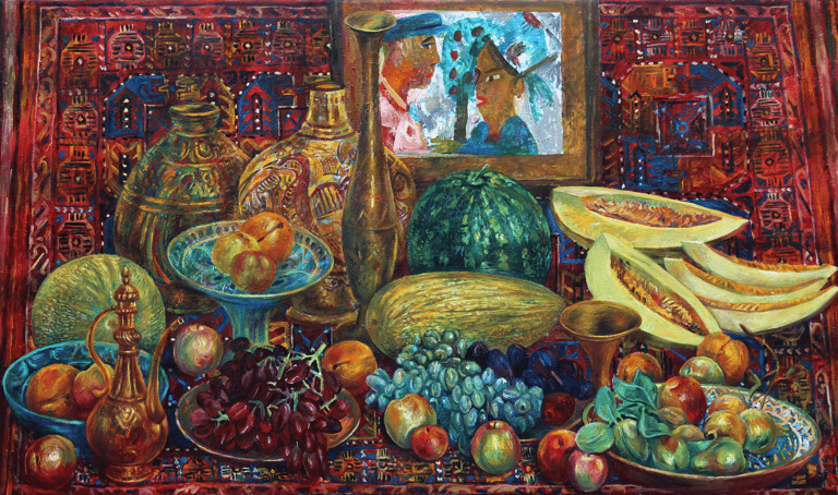 The artist admires the fabulously picturesque magnificence, sonority of colorful shades of succulent fruits and handicrafts of applied arts like carpet, metal and ceramic jugs, vases, plates in the still life “Temptation”. This magnificent abundance, materiality of objects are the body of “the triumph of life”. Placed against the background of the picture, a children’s drawing with an image of a man and a woman in front of an apple tree turns out to be a “window” that reveals the meaning of the scene. She and he are perceived as a symbol of ancestors, and therefore, temptation is implied.