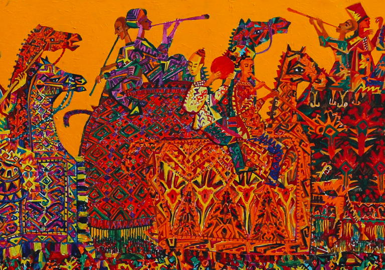 The painting “Bakhshi has arrived to us” is one of the most romantic in the series “Carpet Tales”. With the accuracy of life observations, the canvas of B. Amansahatov is devoid of illustrations. Its figurative structure harmoniously combines ancient ornamental motives, reinterpreted by the artist, with new motives born of modernity. The composition is nothing more than a hymn to the rich and varied ornaments of Turkmen carpets. Emotion and nobility of color, built on the contrast of saturated shades of red with a black background, the expressiveness of painting, in tune with the traditions of folk art, put the picture in a number of the best works of the artist.