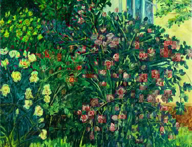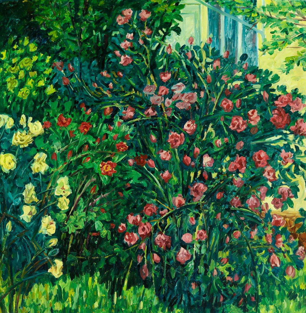 The sonorous coloristic scale, variety and accuracy of tonal relations of the picture are characteristic to the picture “Fragrant roses in my yard”. Young emerald grass spreads as a juicy velvet carpet, blooming bushes of yellow, red roses smell as festively decorated fireworks. The windows of workshop reflect the warm gentle sun rays.