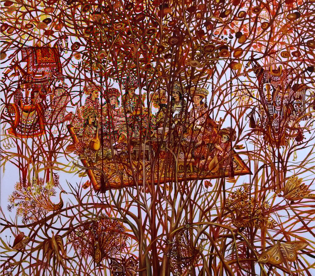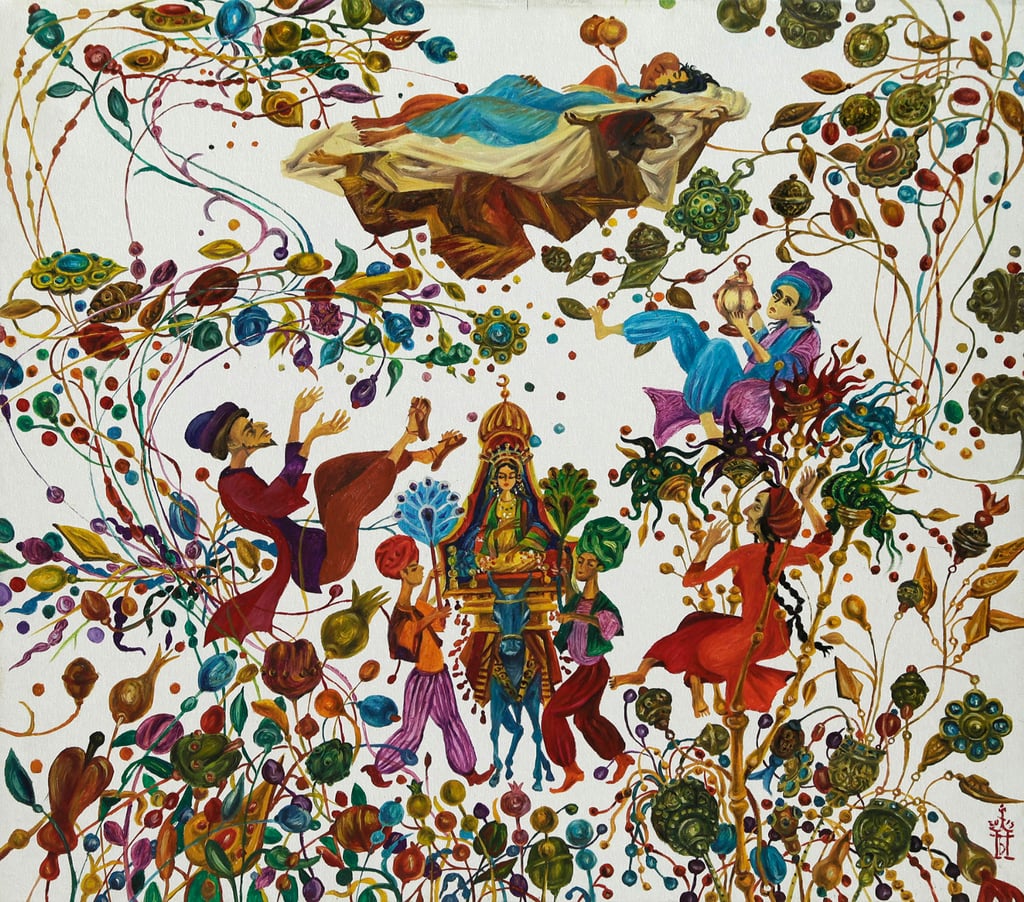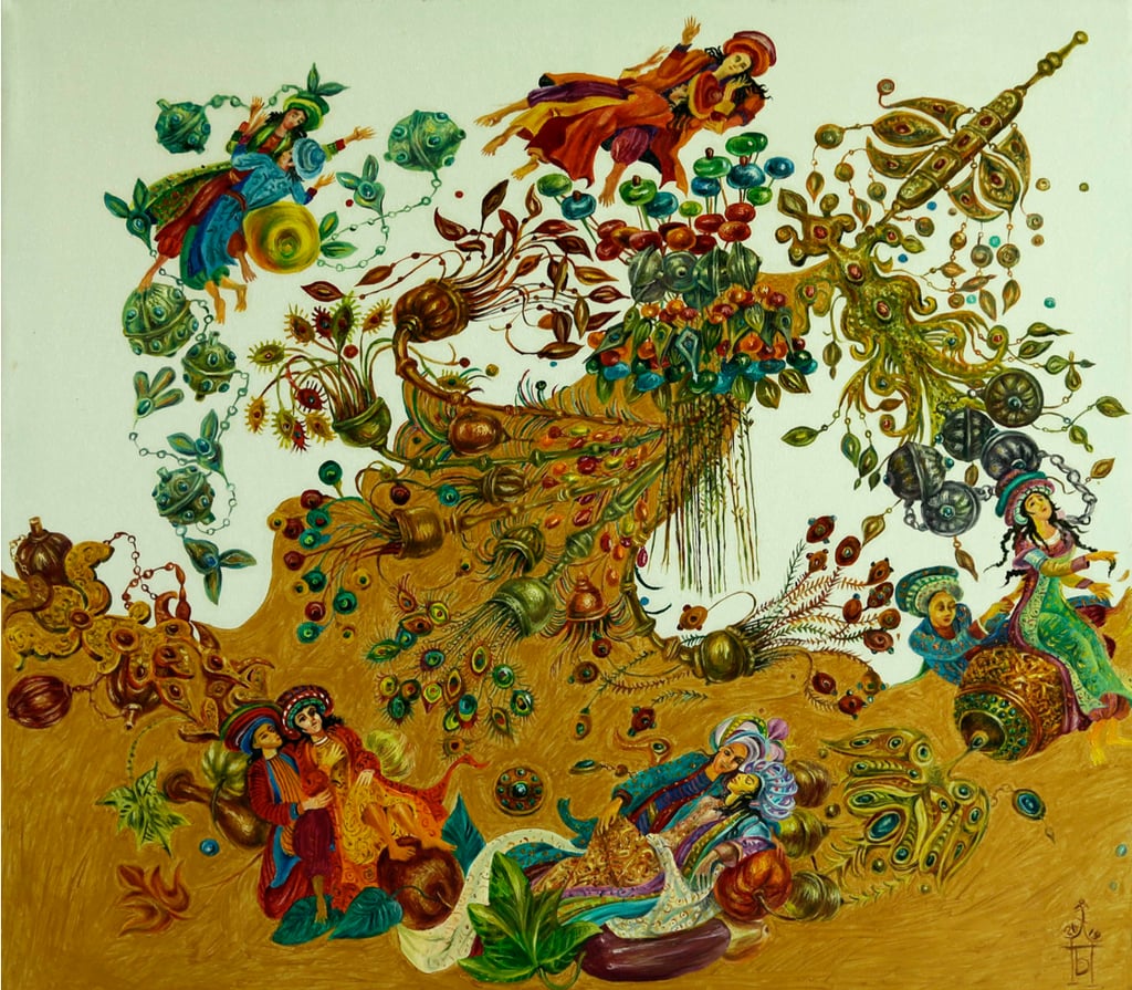 The basis of the image is the motive of a magic talisman, to which the Almighty genie blindly obeys in the painting “Tale about Aladdin’s wonderful lamp”. However, in comparison to the story of “One thousand and one nights”, where the hero, son of a poor tailor, with the help of a magical object gains wealth and marries the daughter of the Sultan, Berdiguly Amansahatov interprets it differentlyss.