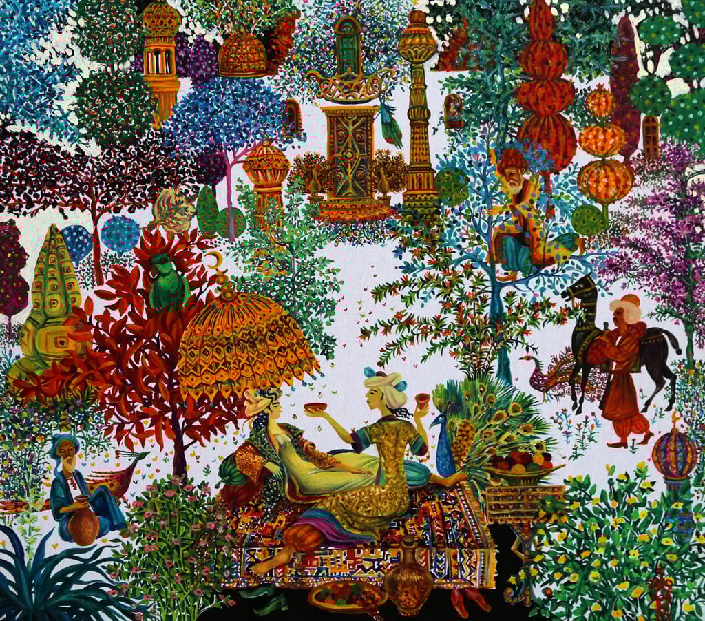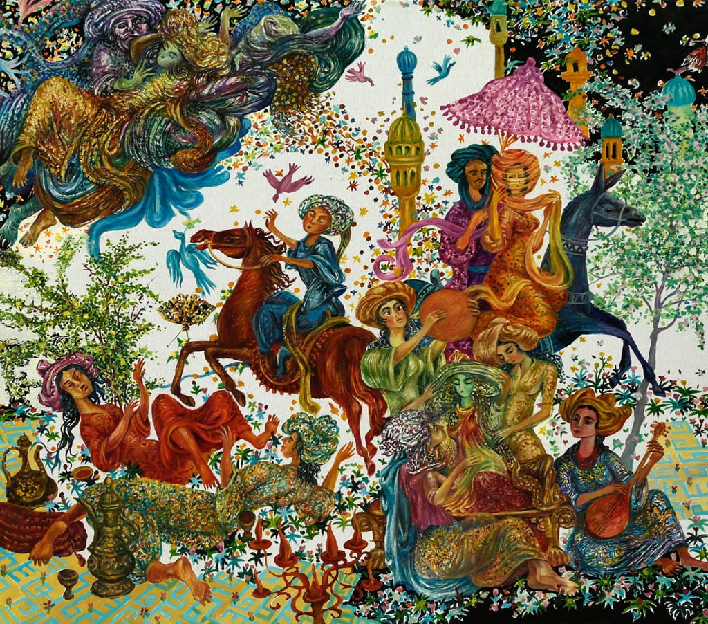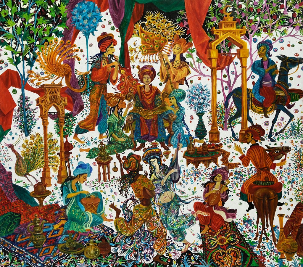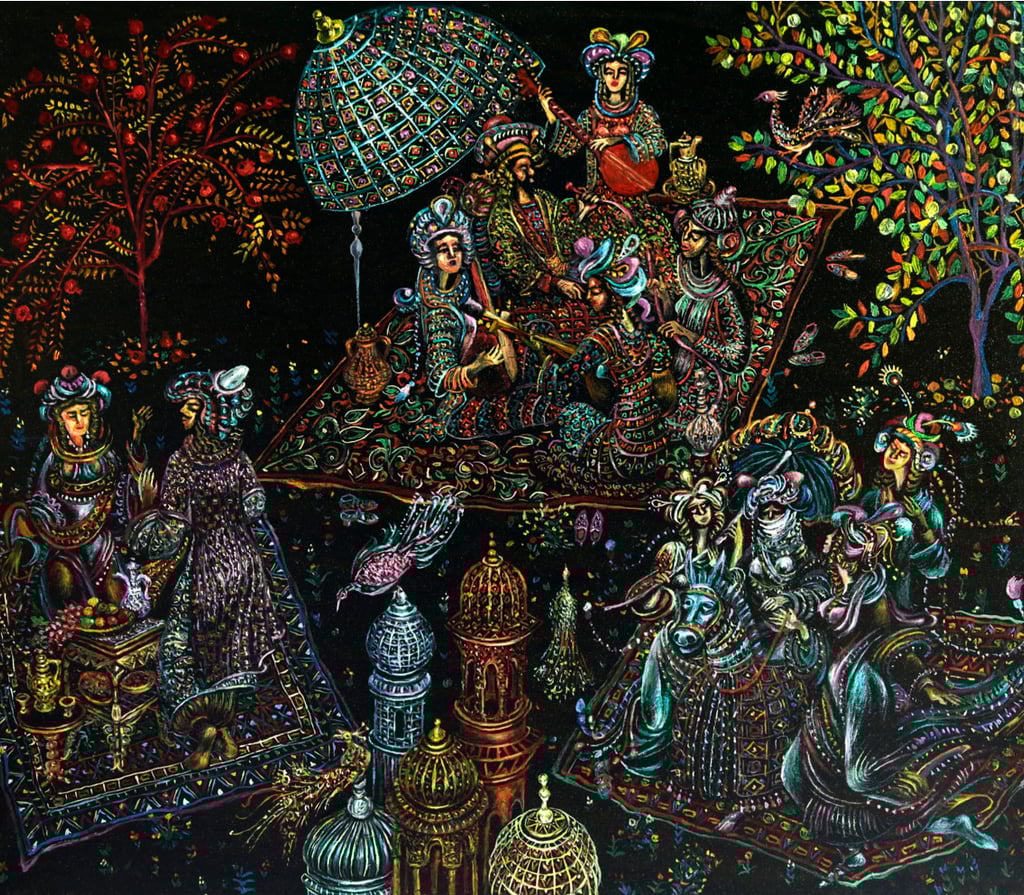 In “A tale of two viziers and Anis al-Jalis” Berdiguly Amansahatov got interested in description of Amusement and palace of Pleasure and Images belonging to the caliph of Baghdad Harun ar-Rashid. We see Nur-ad-Din, feasting with his beloved Anis-al-Jalis, the gardener, Sheikh Ibrahim with a jug filled with wine, as well as the Caliph, dressed into merchant’s clothes, who has climbed a tree to observe the happening of his companion, vizier Jafar.