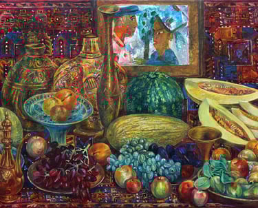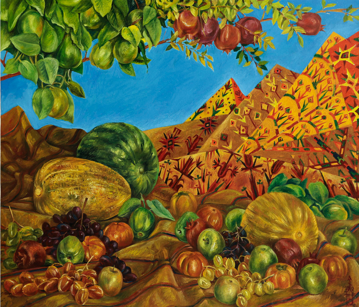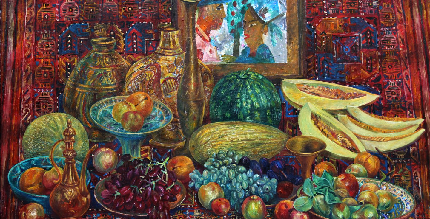The artist admires the fabulously picturesque magnificence, sonority of colorful shades of succulent fruits and handicrafts of applied arts like carpet, metal and ceramic jugs, vases, plates in the still life “Temptation”. This magnificent abundance, materiality of objects are the body of “the triumph of life”. Placed against the background of the picture, a children’s drawing with an image of a man and a woman in front of an apple tree turns out to be a “window” that reveals the meaning of the scene. She and he are perceived as a symbol of ancestors, and therefore, temptation is implied. Moreover, taking into account the fact that the child painted a portrait of Amansahatov, then the artist seems to be saying to himself: one cannot limit oneself to a colorful side of reality and not to see the depths of its true being