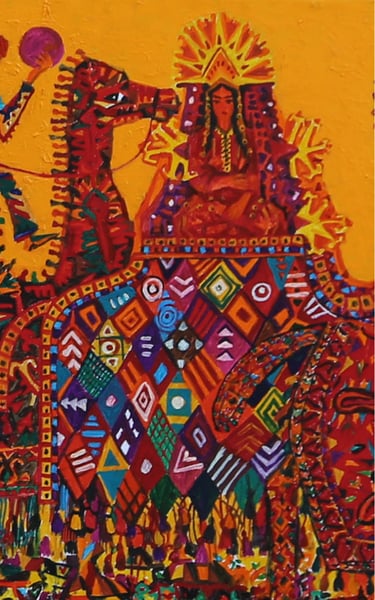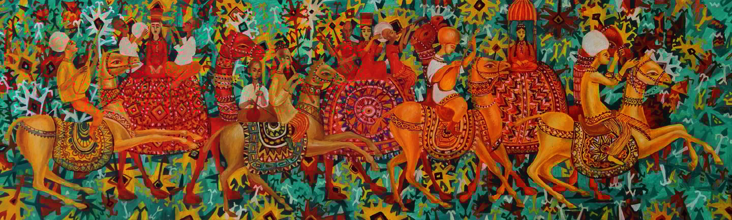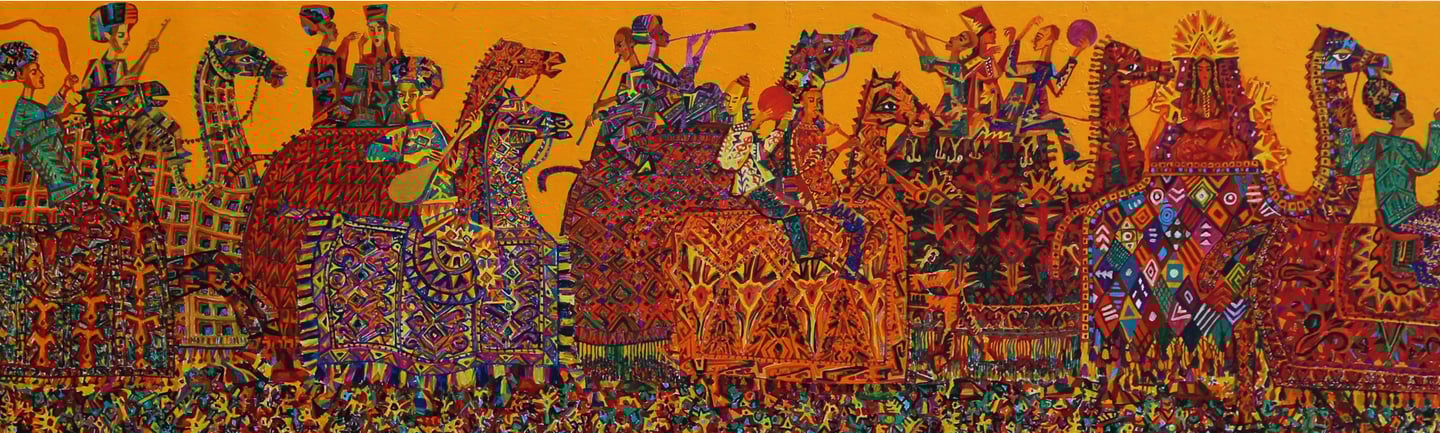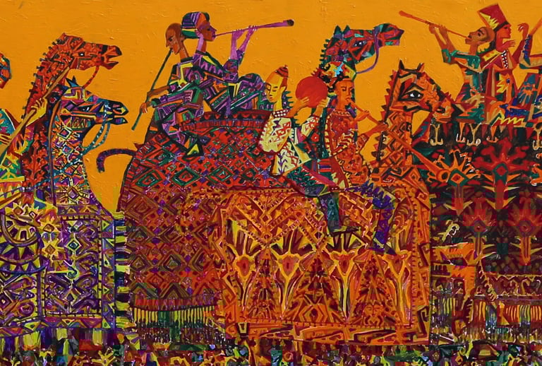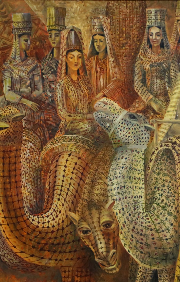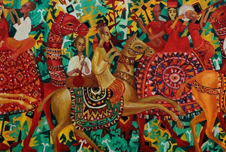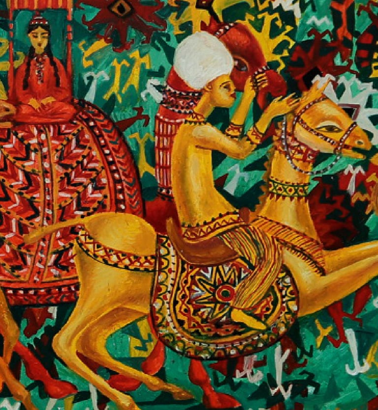 The artist has numerous paintings displaying wedding processions. B. Amansahatov accentuates Turkmen folk clothes the given work. The artist schematizes the composition, reinforces the elements of ornamentation. It emphasizes an idiomatic symbolism of the general plan, close relationship between the wedding decoration and magic, performing various functions, including amulets and purifications