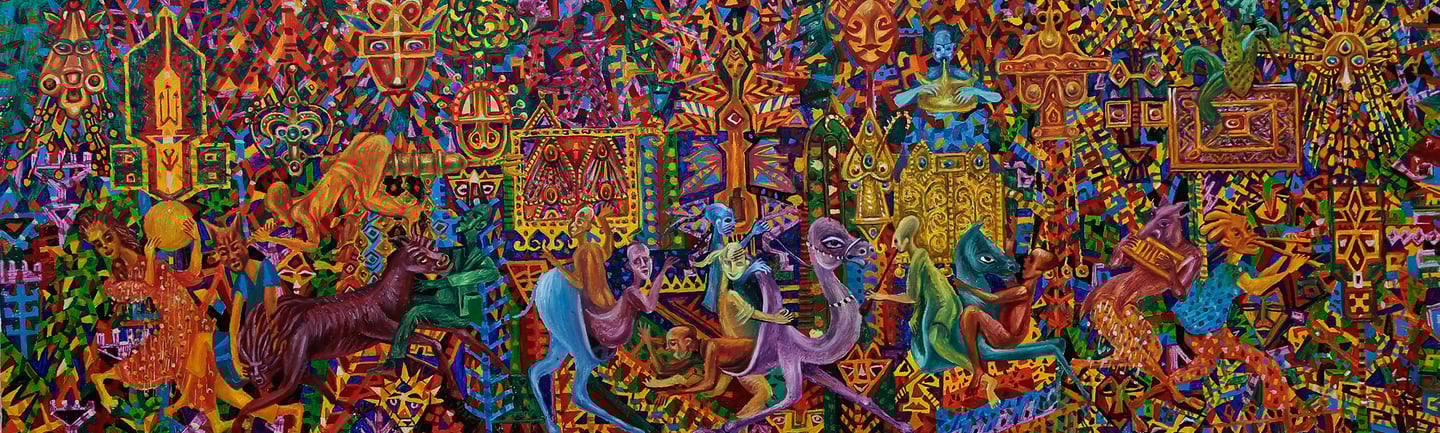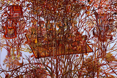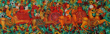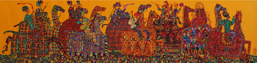 B. Amansahatov again turns to the motif of the wedding procession, but now he depicts a festive cortege against a background of lush greenery. The plot attracts the artist with vitality and energy. In order to convey all the solemnity and joy of the wedding B. Amansahatov strengthens decorativeness of the artistic language. The entire picture is covered with ornaments that are scattered in different directions, then colliding with restless lines. Their color spots sound powerful chords in isolation from the marching plastic figures. The picture is saturated with a special dynamic state of nature, expressive movements of the characters, revealing the elated mood of spring feast.