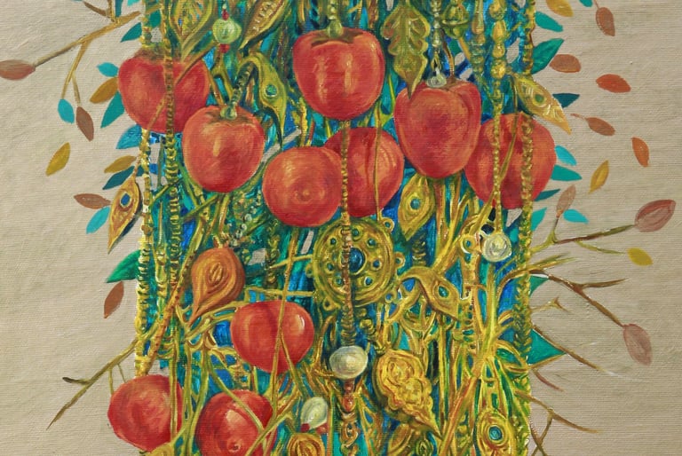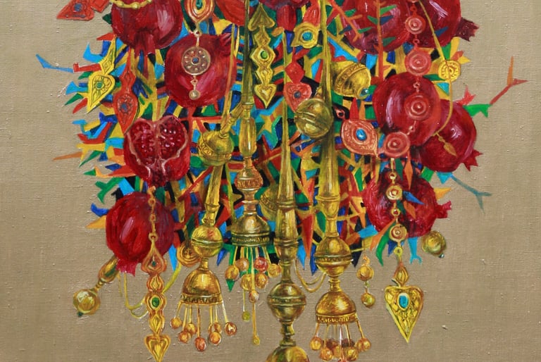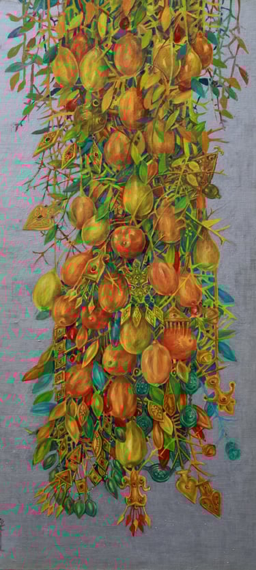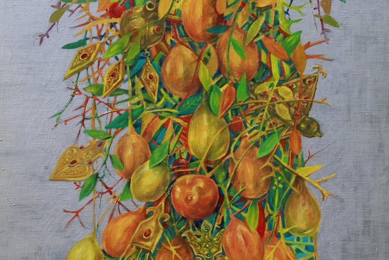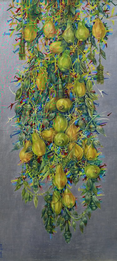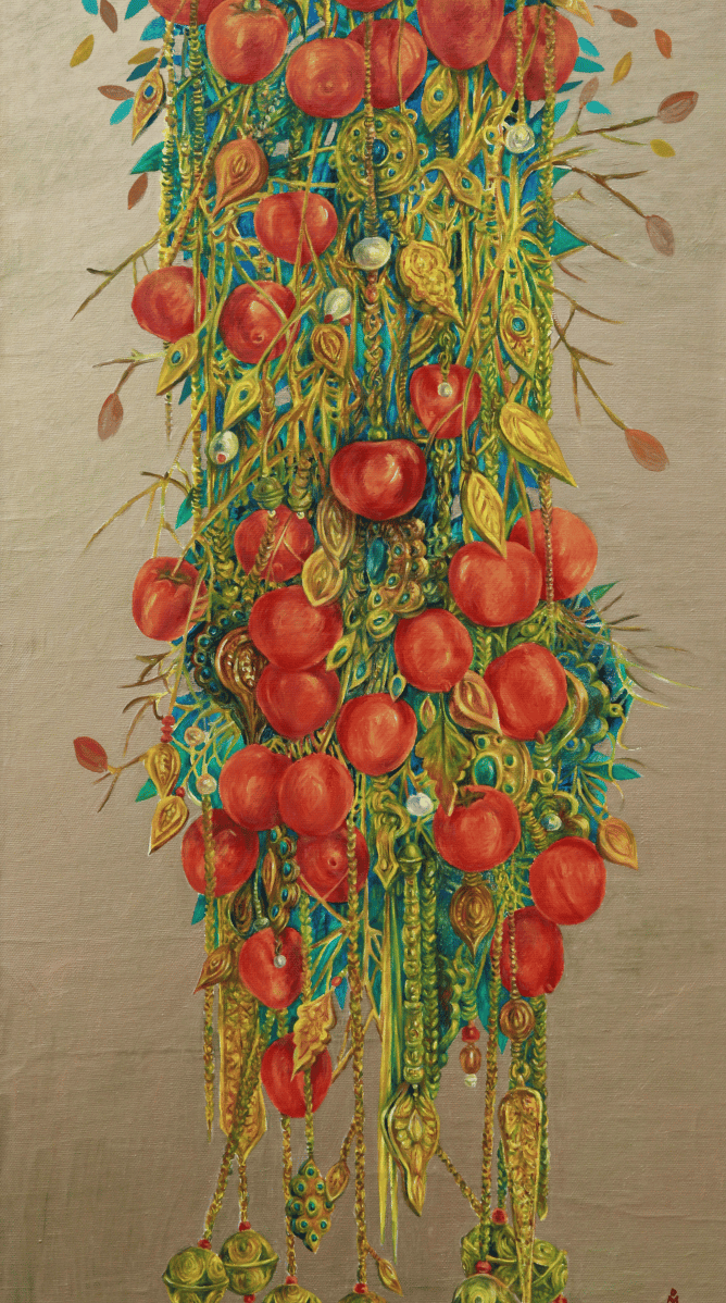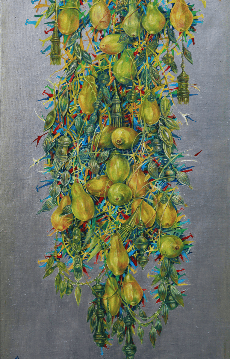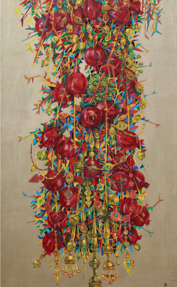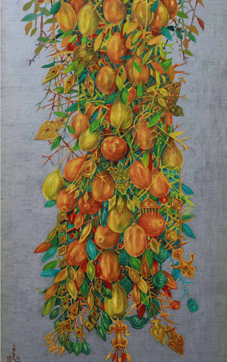 The master achieves excellence in rendering a dynamic state of nature in the carefully designed series “Radiant East”. The artist conveys the inexhaustible beauty of nature and artificial objects in the interweaving of ornaments with branches, in the curves of restless motion of leaves, in the clear rhythm of large fruits, in the adornments. Paintings remind of the finest melodies of folk music through images, impalpable details, linearity.