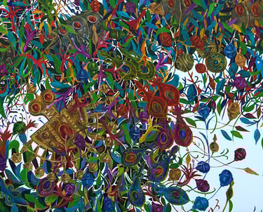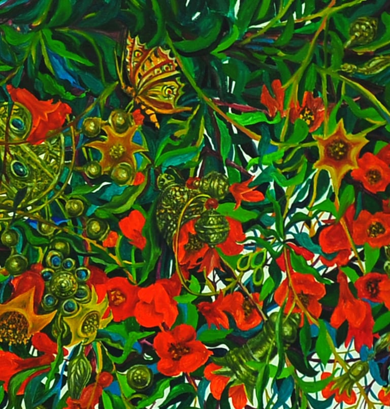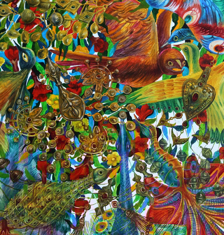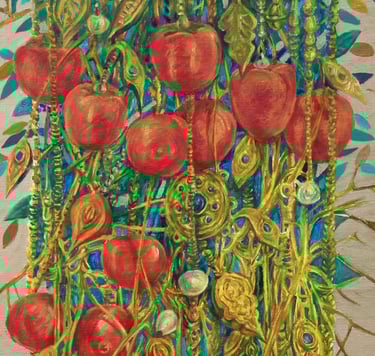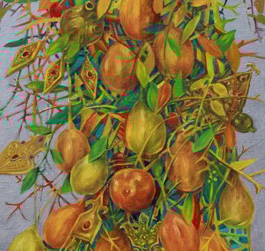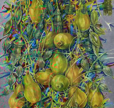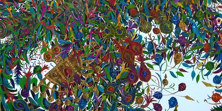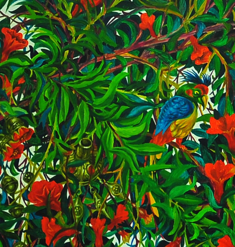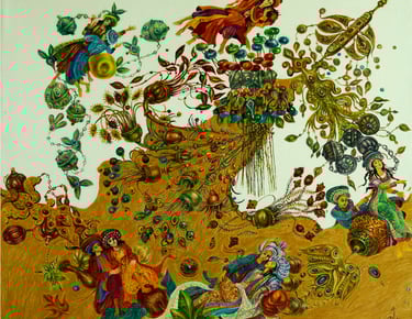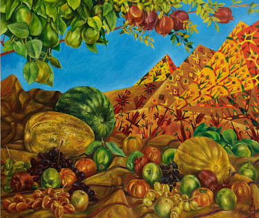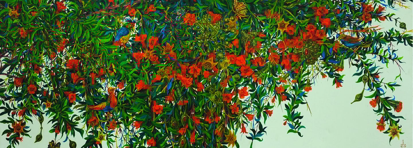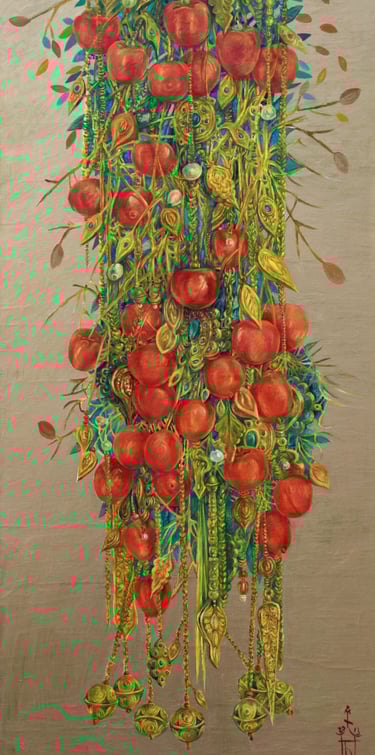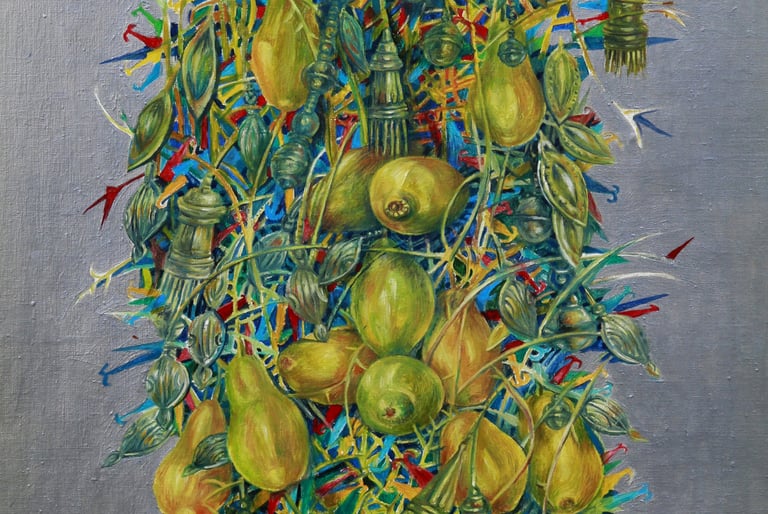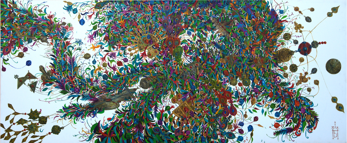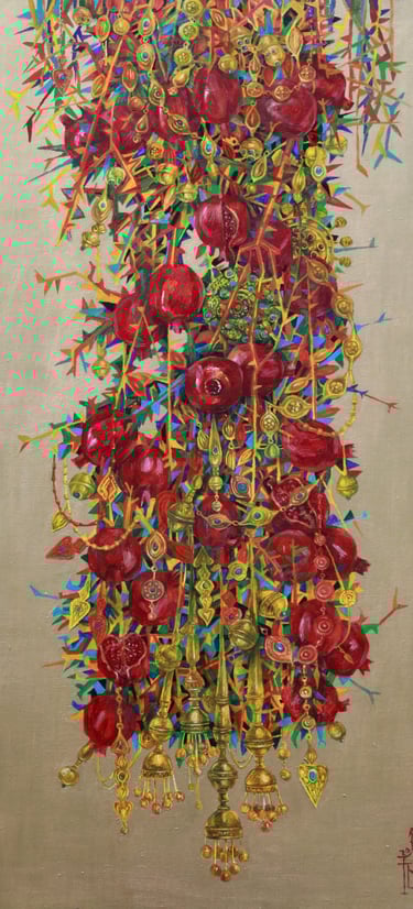 The master achieves excellence in rendering a dynamic state of nature in the carefully designed series “Radiant East”. The artist conveys the inexhaustible beauty of nature and artificial objects in the interweaving of ornaments with branches, in the curves of restless motion of leaves, in the clear rhythm of large fruits, in the adornments. Paintings remind of the finest melodies of folk music through images, impalpable details, linearity.