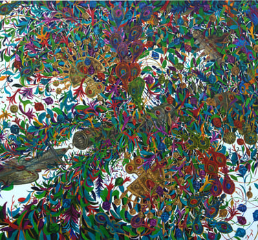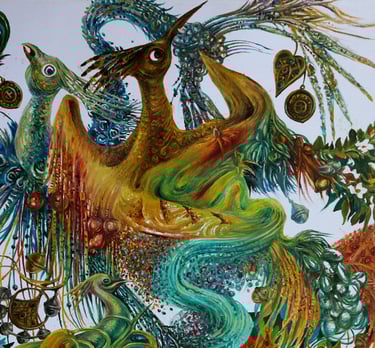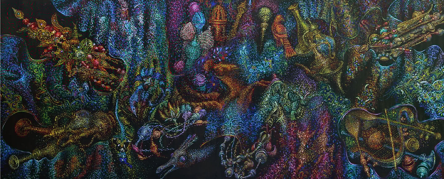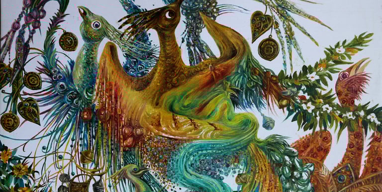 Blank white canvas as a background for his work the triptych “Life” (“Beginning”, “Perfection”, “Harmony”) is used for the first used. It clearly frames a painting tending to flexible and rounded shapes, to bright color. The world is ideated to the artist as colorful, bright, “the garden of nihility”, kingdom of eternal spring. An indelible impression is left after contemplating colors, magnificent forms, expressiveness and solemn grandeur of composition.