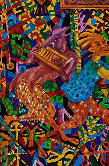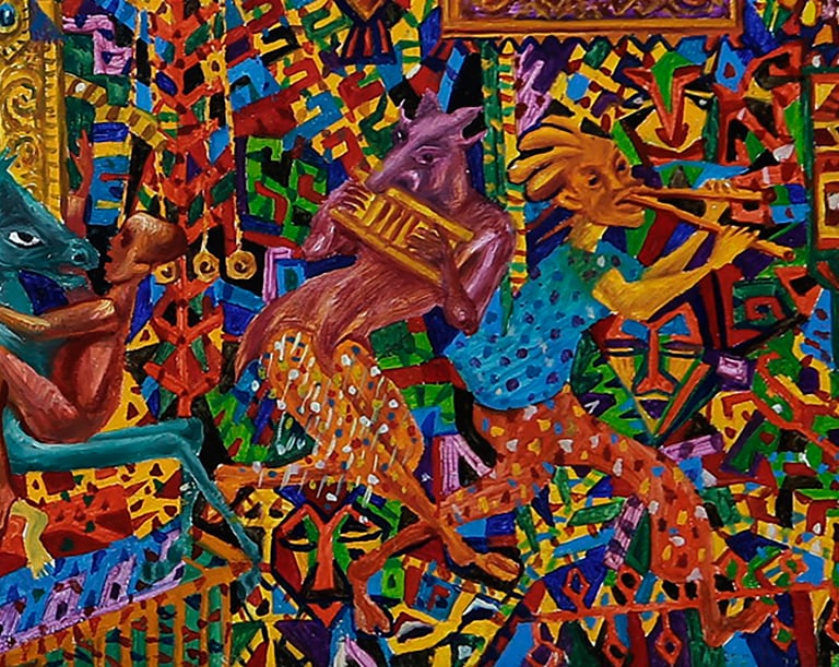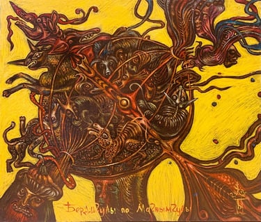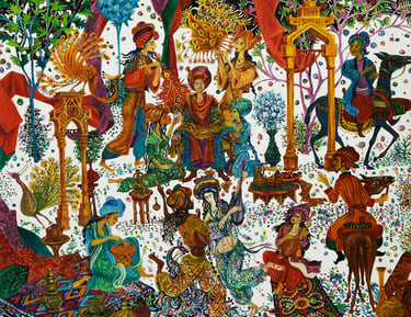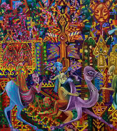 Throughout his creative life B. Amansahatov has been addressing to actual themes, dramatic plots, symbolic implications. The life of human society sometimes amazes the artist with its senseless noisy bustle. Occasionally the master perceives life as a game, whereas the characters of people as a change of masks. A theater for Amansahatov is life, and life is a kind of scene. He sees game, deceit, pretended grief and joy everywhere. Creative revelation has emotionality, impulsiveness of experience in the work “Masks, Masks, Masks ...”. The analysis of the plot of the picture reveals a very complex semantic basis of national folklore. The master reveals such an inexhaustible ingenuity in the composition that the viewer has to unravel the essence of each individual figure, framed in ornamentation of the background.