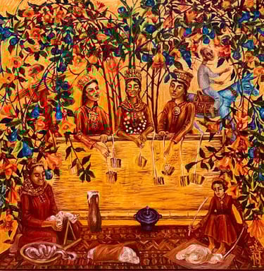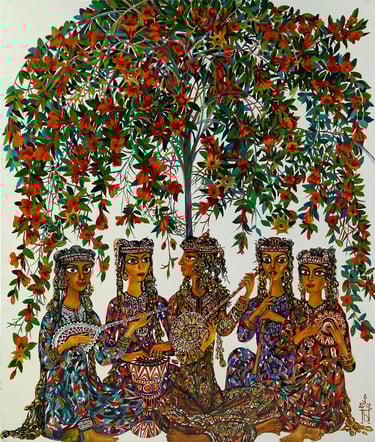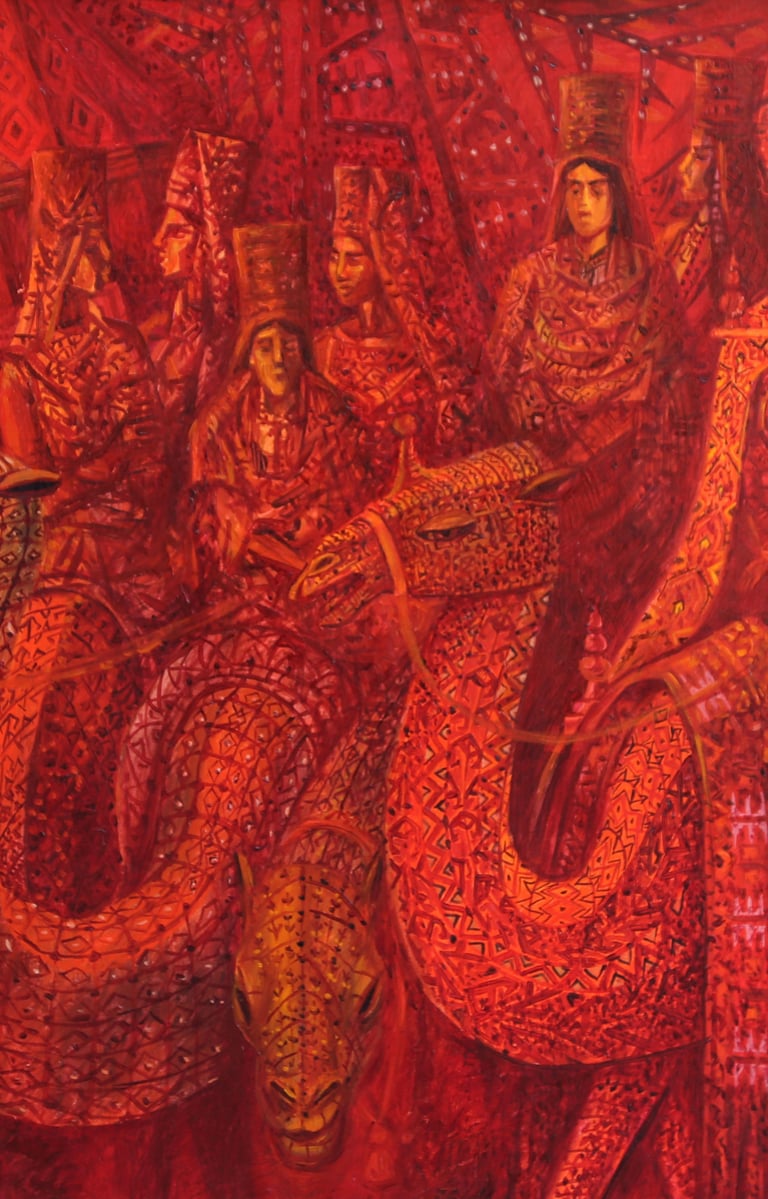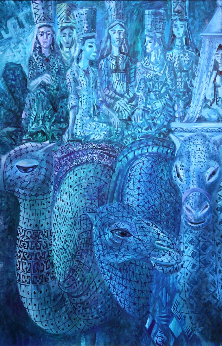 According to the artist it is the folklore that helps to the people to preserve their national originality. He creates a generalized image of the “warrior queens”, representing something “eternal” holy and highly significant for our people from time immemorial. Women dressed in festive clothes, with national high headdresses decorated with traditional silver embellishments are represented with great admiration. These images, filled with dignity, have the the features of ideal Turkmen woman, that is kind, modest, delicate and noble.