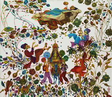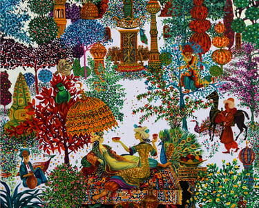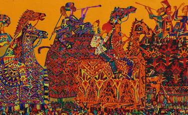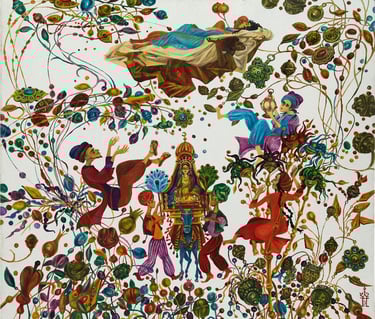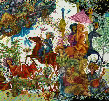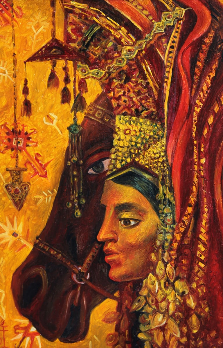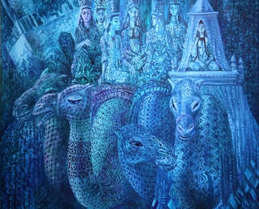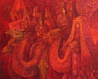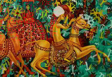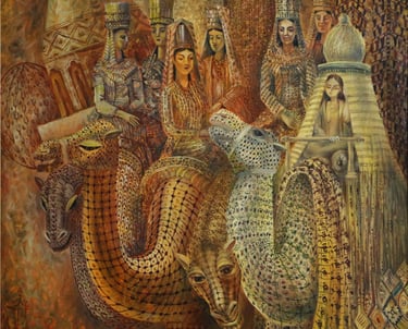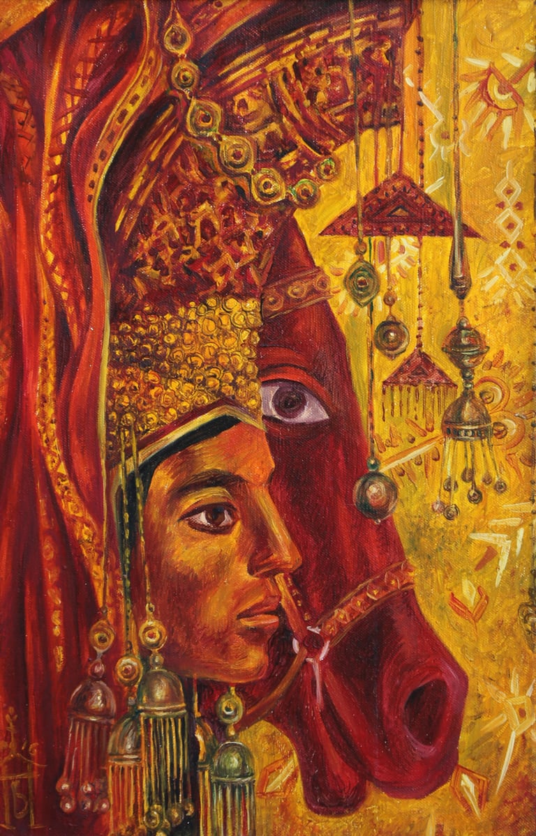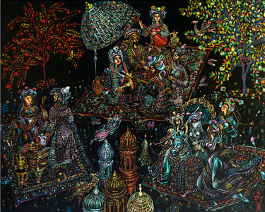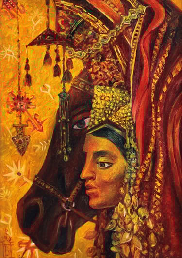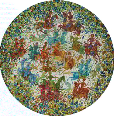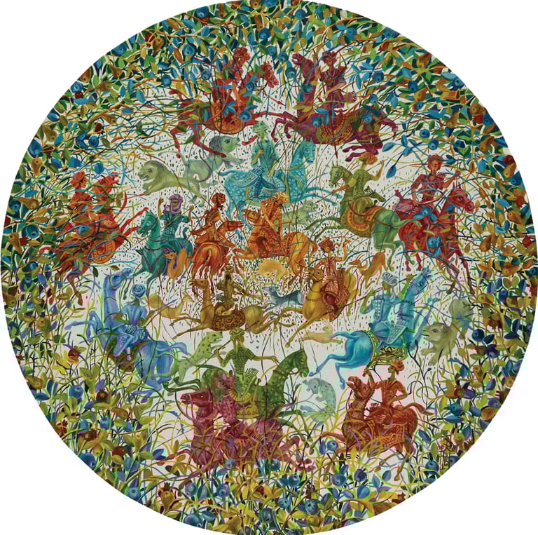 The painting “The Royal Hunt” from the series “One thousand and one nights”, done in the “tondo” format, reveals the mysterious world of royal pleasures – a scene of a medieval hunt. It is a dynamic composition in a circle with refined movements of hunters, interpreted in the traditions of oriental miniatures and complemented by a circular frame of floral patterns. This vegetative - ornamental frame gives a theatrical character to the genre plot.