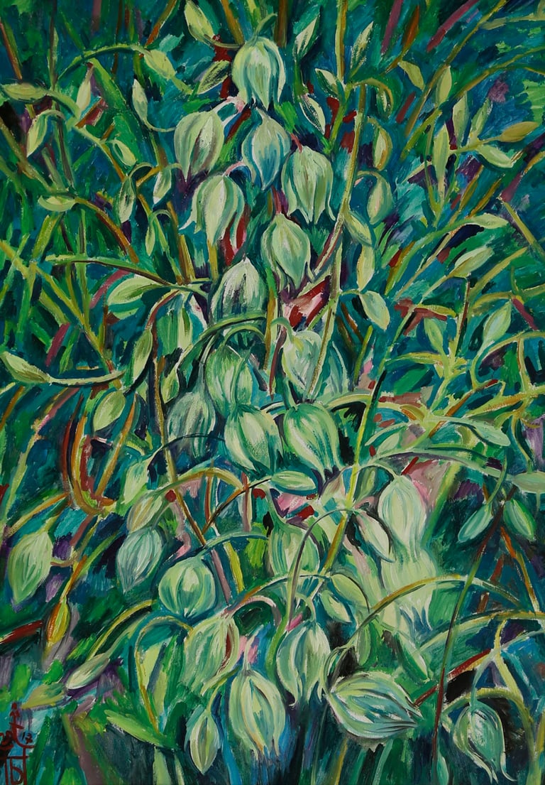 Nature for artist is a source of inspiration. In the work “Bell toll” the image of the bellflowers anticipates the features of large paintings of the artist with his favorite motifs of jewelry. The bright decorative temperament of the master is combined with the fidelity to the sensation of life. A comparison of the light green hue of the flower to a dark blue-green background makes the color scheme distinct bright and sonorous. Vivacity and pliability of the strokes emphasize the bends of the twigs, leaves and flowers. In their restless motion the artist organizes a space full of life and movement.